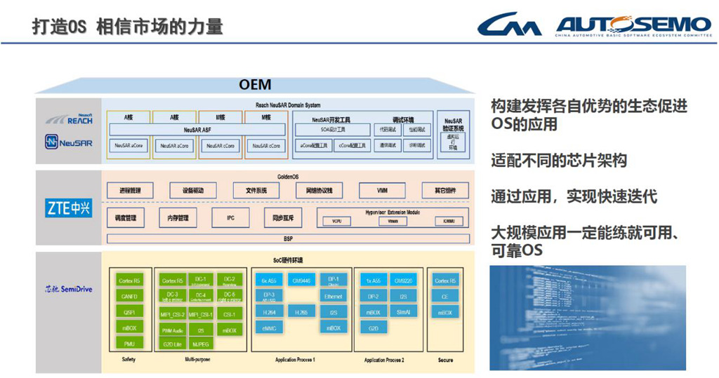 面对这些挑战,东软睿驰基于多年研发积累,推出汽车基础软件平台产品-NeuSAR,包含cCore、aCore、ASF以及配套的设计开发和调试工具链,为汽车软件在新架构下的研发提供了完整解决方案。去年底,东软睿驰和中兴通讯达成战略合作,正在积极推动东软睿驰NeuSAR平台+底层中兴GoldenOS车用操作系统+SoC国产芯片厂商联合,共同构成数字汽车的智能底座,助力广大主机厂和Tier1厂商共同打造国产汽车生态系统。