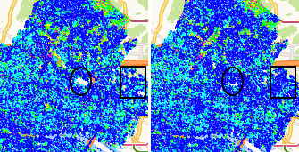 如图1,左边黑色圆圈和方框示例的区域即为MR数据量不足呈现的空白覆盖区域,右边为补充后的完整覆盖图。
