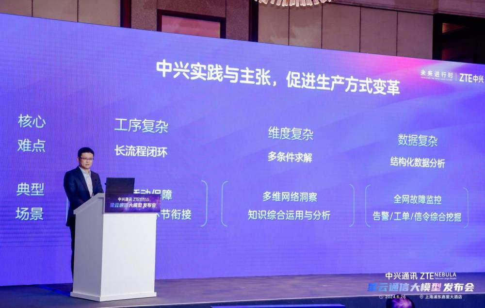 6月26日,在MWCS24上海展期间,中兴通讯举办了星云通信大模型发布会,正式推出星云通信大模型系列化产品,涵盖星云通信大模型、Agent工厂和系列化应用产品。通过从模型到平台再到应用,提供炼好模型和用好模型的完整体系,实现面向高阶自智网络的全面赋能。