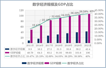 国务院印发的《“十四五”数字经济发展规划》提出,“到2025年,数字经济迈向全面扩展期,数字经济核心产业增加值占GDP比重达到10%,数字化创新引领发展能力大幅提升,智能化水平明显增强,数字技术与实体经济融合取得显著成效”的总目标。数字技术已经广泛渗透于生产、分配、流通、消费各环节,并持续向经济发展的各个领域渗透,数字经济占比不断提升,数据要素与传统产业广泛深度融合,对经济发展释放巨大价值。国民经济中各行业的数字化转型无论从广度还是深度上都进入了一个新的阶段。