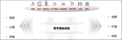 第二层含义是产业数字化,就是利用现代信息技术对传统产业进行全方位、全角度、全链条的改造。通过数字基础设施把供给侧的链接、算力、智能和需求侧的应用、价值、体验链接起来,形成各种解决方案,来促进对各垂直领域的变革和效率提升。
