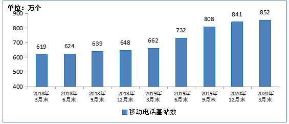 2018-2020年3月末移动通信基站数发展情况
