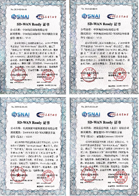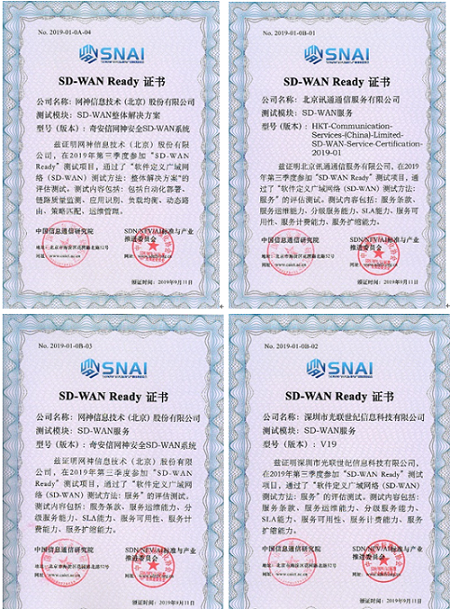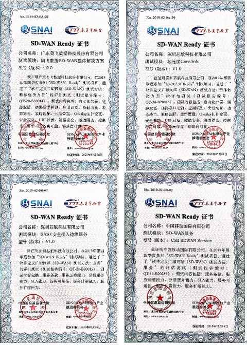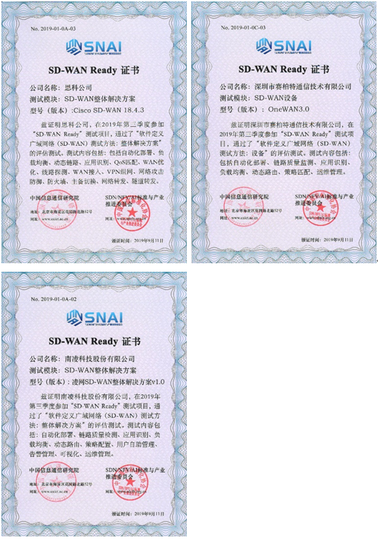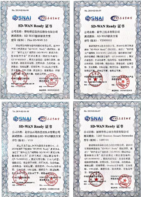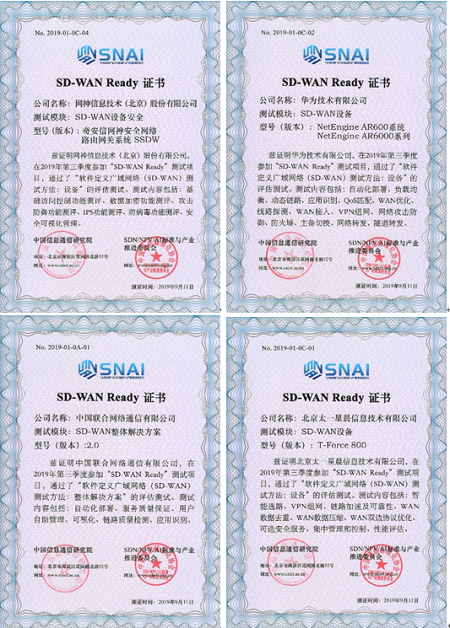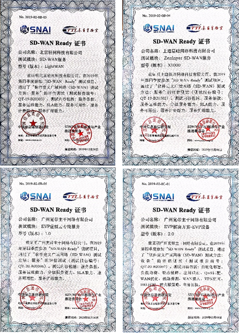 2019 年 4 月 19 日,CCSA SDN/NFV/AI标准与产业推进委员会(TC610)SDN 集成与互通测试组联合 SDN 技术与规范合作组在中国信息通信研究院召开了“SD-WAN Ready测试项目”启动会,SD-WAN Ready项目正式启动。截止到2019年8月底,第一期测试项目共有9家企业通过了测评并拿到了“SD-WAN Ready测试项目” 证书。自2019年9月11日 “2019年SD-WAN产业发展论坛”在北京顺利召开后,顺利启动第二期测试项目。截止到2020年2月底,第二期测试项目共有14家企业通过了测评并获得“SD-WAN Ready测试项目”证书。以下为第一期及第二期获得证书企业名单,分别是: