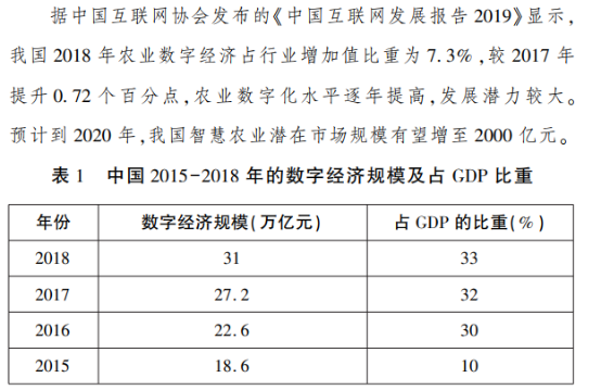 《中国数字乡村发展报告(2019)》提到:据中国互联网协会发布的《中国互联网发展报告2019》显示,我国2018年农业数字经济占行业增加值比重为7.3%,较2017年提升0.72个百分点,农业数字化水平逐年提高,发展潜力较大。预计到2020年,我国智慧农业潜在市场规模有望增至2000亿元。
