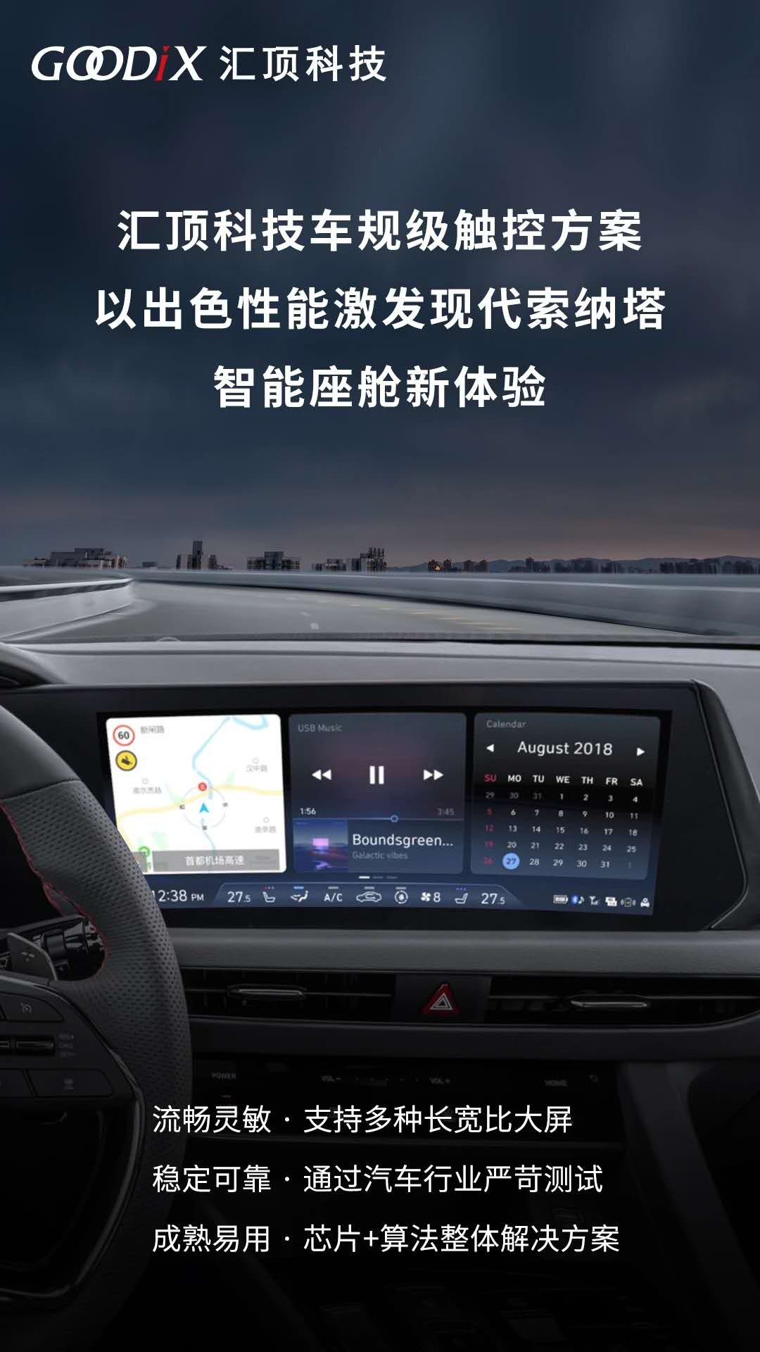 随着消费者对汽车智能化的需求日益高涨,车载信息和娱乐系统功能随之愈加丰富,同时也对便捷的汽车人机交互界面、触控技术提出了更高要求。汇顶科技提供的芯片+算法的车规级触控整体解决方案,能提供与智能手机同等的操作灵敏度和准确度,并符合车载状况下严苛的可靠性要求。