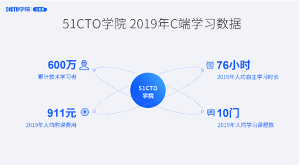 会上,51CTO副总裁邵燕就新产品发表了介绍讲话。邵燕首先分享了过去一年中51CTO学院C端的学习数据,以及企业版的线下培训数据:2019年51CTO学院C端累计600万技术学习者,人均自主学习时长高达76小时,人均学习课程数10门,人均购课费用911元;2019年企业版线下培训总天数高达1249天,平均每天3.4场。惊人的数字表明了学习不仅是技术人员的个人诉求,也是企业对员工的要求,是每个职场人的常态。
