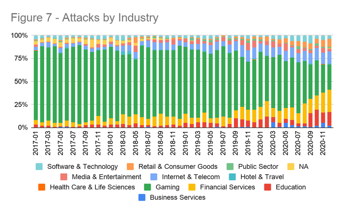 图三、Akamai统计的各行业遭受的DDoS攻击情况