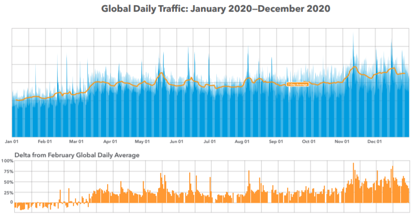 2020年,人们在互联网的帮助下才得以继续工作、学习和沟通。《世界变幻莫测,我们灵活应对》报告展示了互联网的真正韧性。例如,在刚开始实施疫情封锁令时,Akamai发现互联网流量增加了30%,之后全球开启远程模式并持续至今。