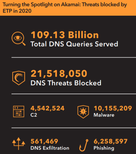 报告显示,在2020年,Akamai共面对了合计1090亿次DNS查询(即每天约2.99亿次DNS查询)中的2150万次恶意查询。这些攻击大部分是恶意软件攻击,Akamai在2020年记录了1020万个与恶意软件相关的被阻止请求。此类攻击可能是由于用户点击了电子邮件、文档、甚至网站中的恶意链接,但阻止事件的具体原因仍然不得而知。
