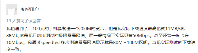 用户2:“200M的宽带,实际下载速度最高也就11Mb/s即88Mb,这是我目前所测过的极限最高网速,一般情况下只有50Mbps,甚至还一度卡在10Mbps”