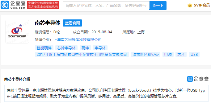 企查查信息显示,南芯半导体是一家电源管理芯片解决方案供应商,公司成立于 2015 年,法定代表人为阮晨杰,经营范围包含:从事半导体科技、计算机科技、电子科技领域内的技术开发;集成电路、电子产品、计算机软硬件的研发等。