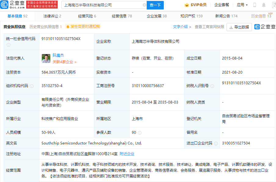 企查查 App 显示,8 月 20 日,上海南芯半导体科技有限公司发生工商变更,新增维沃移动通信有限公司、上海龙旗科技股份有限公司等多名股东,同时公司注册资本由约 553.56 万元人民币增加至 584.37 万元人民币,增幅 5.57%。