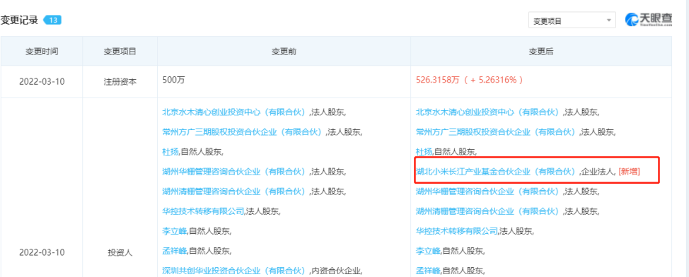 天眼查APP显示,近日,北京至格科技有限公司发生工商变更,新增股东湖北小米长江产业基金合伙企业(有限合伙),同时公司注册资本由500万元增加至526.32万元。