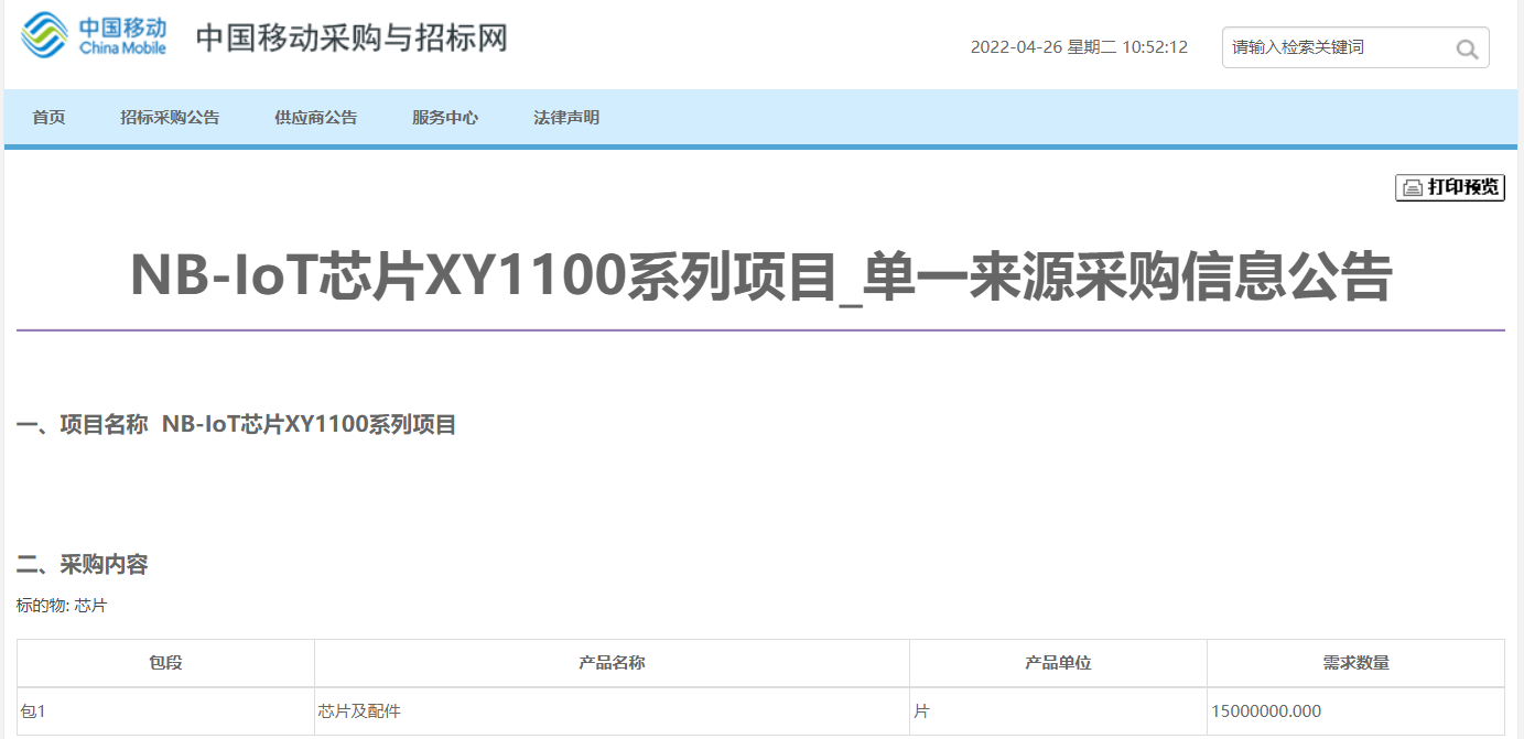 本次中国移动旗下中移物联网有限公司采购数量是去年同期采购数量的近两倍。据了解,该项目的单一供应商芯翼信息科技,在去年5月作为单一供应商芯翼信息科技就已获得中移物联网有限公司NB-IoT芯片XY1100采购项目的800万片订单。