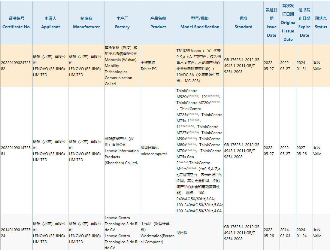 现有一款型号为 TB132FUxxxxx(“x”代表 0-9,a-z,A-Z 或空白,销售不同客户)的平板电脑通过了国家 3C 认证,由摩托罗拉武汉工厂生产,有数码博主称其为联想小新 Pad Pro 2022。