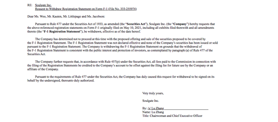 社交平台Soul今日向美国证券交易委员会(SEC)提交的文件显示,该公司决定撤回F-1登记声明文件,不再根据F-1文件发行证券。