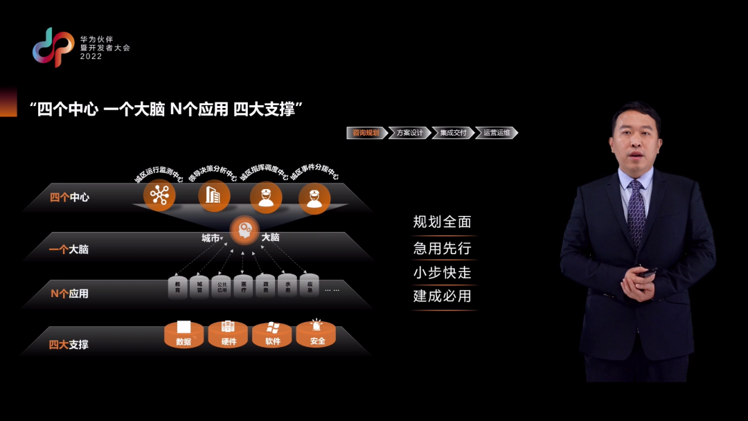 在实践案例分享环节,华海智汇现场讲述了与华为及生态伙伴高效协同,融会贯通,实现价值交付的智慧龙岗2.0数字化转型项目。华为、华海智汇和伙伴在智慧龙岗建设现状的基础之上总结经验,全面规划,历时三个多月对客户需求收集提炼为四大类别:城市大脑、行业应用、基础设施、新技术和新标准等其他需求,并形成“一个大脑、四个中心、四大支撑、N个应用”的智慧龙岗2.0建设思路。在整体方案架构上,从深化民生服务应用、推进数据融合共享共用、加强业务应用支撑、扩展信息化基础设施等几个方面进行总体规划设计。