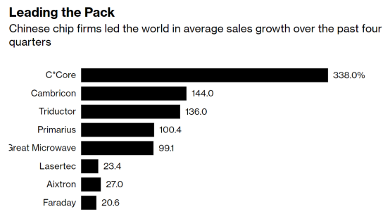 根据彭博汇编的数据,相在过去四个季度中,全球20家增长最快的芯片行业公司中,有19 家来中国大陆。相比之下,去年同期只有8个。如果从增长速度的角度看,这些对芯片制造至关重要的设计软件、处理器和设备的中国供应商数倍于台积电或ASML等大型半导体公司。