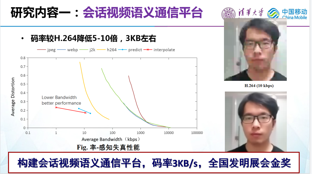 陶晓明教授介绍了会话视频语义通信平台,这是团队前期重要的研究内容与成果。相比于传统H.264编码,语义通信在相同质量下将码率降低为10-20%,即降低到3KB左右。该平台核心技术优势在于不再对像素进行流式传输,而是通过语义编码器提取头部姿态和面部表情的运动参数,将其编码为比特流传输。接收端语义解码器根据头部姿态和面部表情参数驱动参考帧,合成说话人头部。
