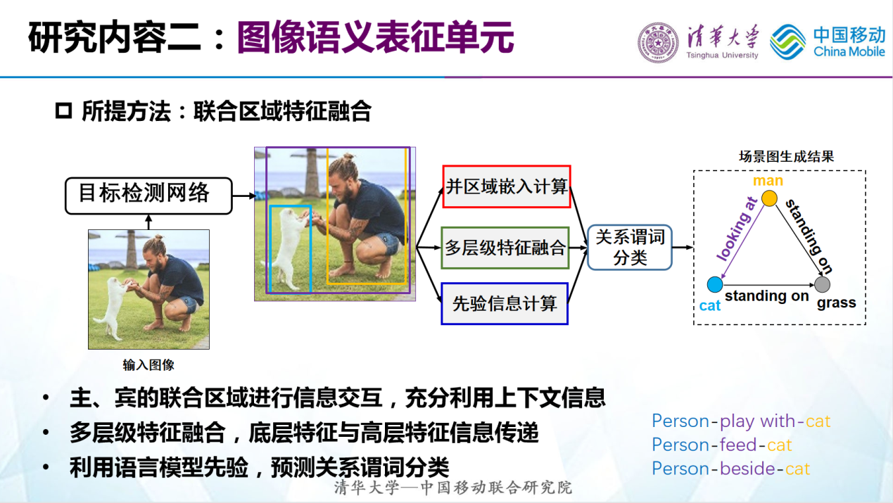 陶晓明教授提出图像结构化表征方法,将高维的图像降维成“主谓宾”三元组的低维表达,表达图像的内在含义,即目标与关系。联合区域特征融合的场景图生成方法,充分利用上下文信息,将主语和宾语的联合区域进行信息交互。融合多层级的特征,并利用语言模型先验,预测关系谓词分类。该方法提升了召回率,能准确、全面的检测出图像的复杂语义信息。