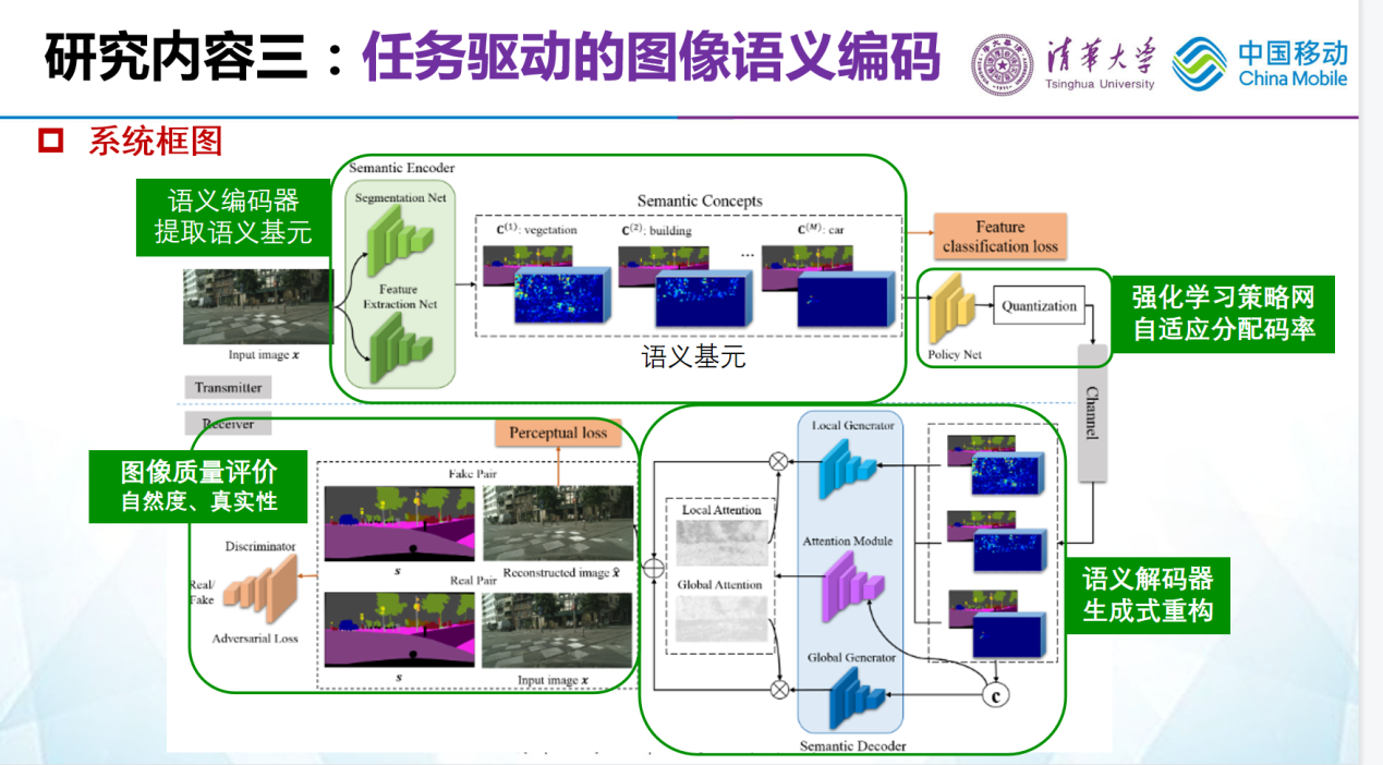 陶晓明教授提出任务驱动的图像语义编码方法,面向下游的语义分析任务,如目标检测、语义分割等,提取与传输任务相关的语义信息。设计基于深度强化学习的码率自适应分配方法,将重要的语义基元分配更多的比特。设计基于生成对抗网络的图像生成式重构方法,将语义基元重建为图像目标。该方法大幅提升低码率图像编码的性能,重建质量优于JPEG, JPEG2000,BPG等工业图像编码方法,并使能下游语义分析任务。