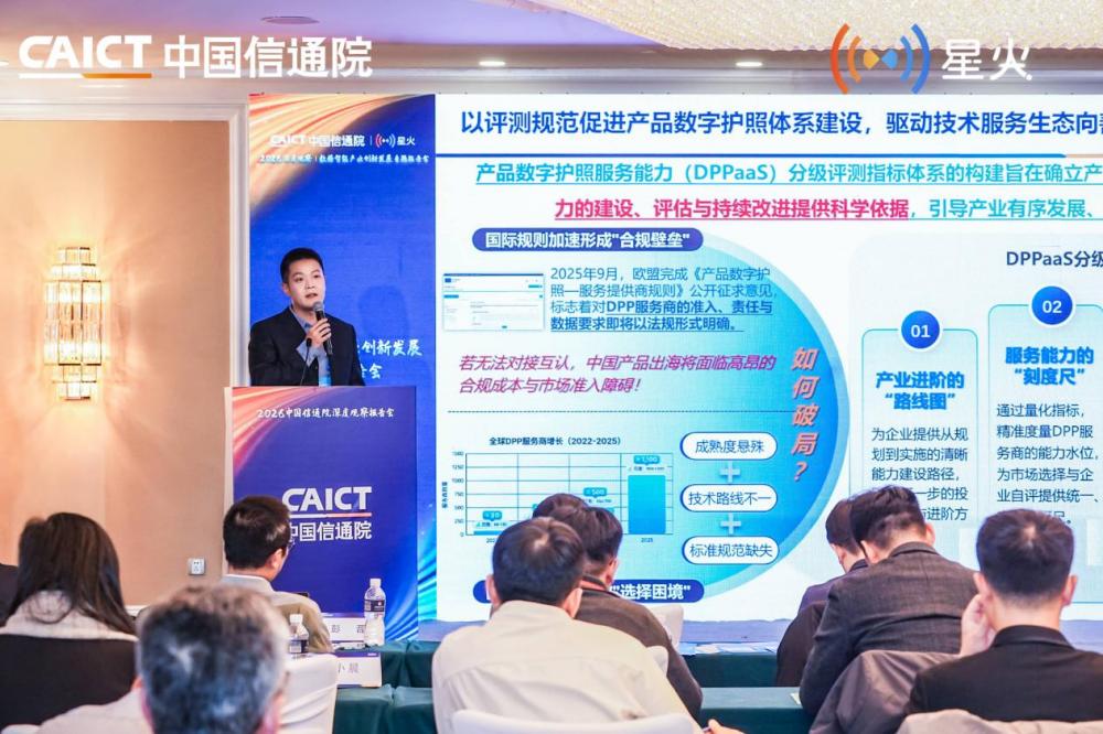 中国信通院工业互联网与物联网研究所数据与智能业务部副主任李胡升发布并解读了《产品数字护照服务能力(DPPaaS)分级评测指标体系1.0》。该指标体系“以评促建”助力产品数字护照体系健全完善,推动DPP服务生态向善向好发展。