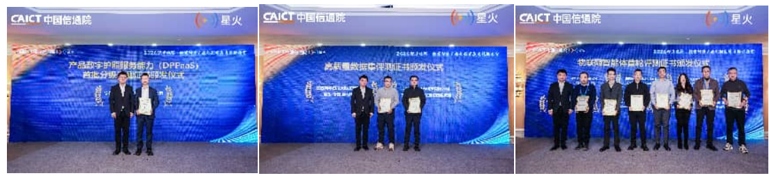 在评测证书颁发环节,金键为产品数字护照服务能力、高质量数据集、物联网智能体3个方向评测中表现优异的企业代表颁发证书。