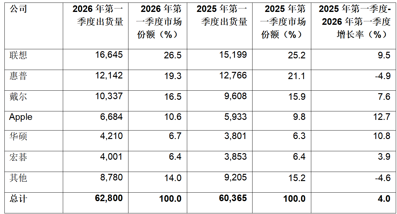 表一、2026年第一季度全球PC厂商单位出货量初步估算值(单位:千台)