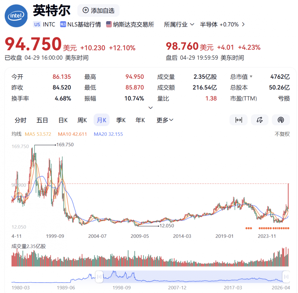 C114讯 4月29日,英特尔股价单日大涨12.1%至94.75美元,创下历史新高。