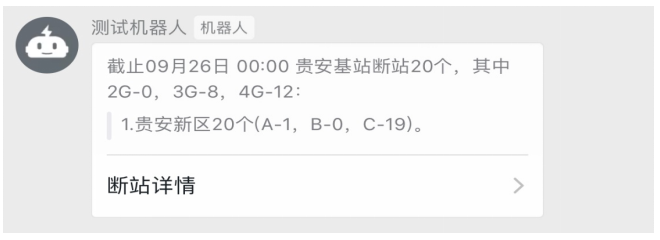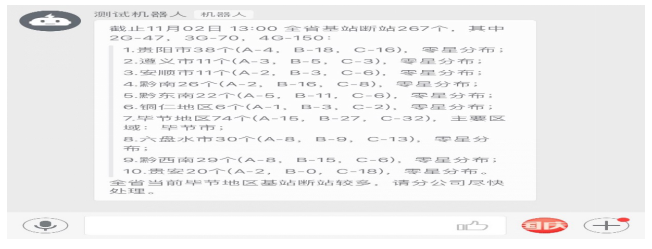 钉钉群机器人每小时0分,定时对全省各地市的基站断站信息,根据设备类型和设备等级两种维度进行数据统计,并按照相应模板生成通报信息,调用钉钉自定义机器人接口,将信息发送至地市分公司运维钉钉群中。同时加入发送失败检测机制,确保信息正常发送。