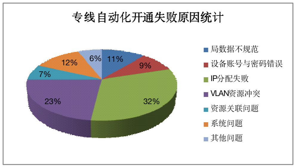 配置自动激活是最先实现自动化的应用,2016年宽带配置基本实现了自动配置激活,2019年城域网也开始研究专线自动配置激活,在整个应用测试过程中,专线自动开通失败原因统计如下图3所示: