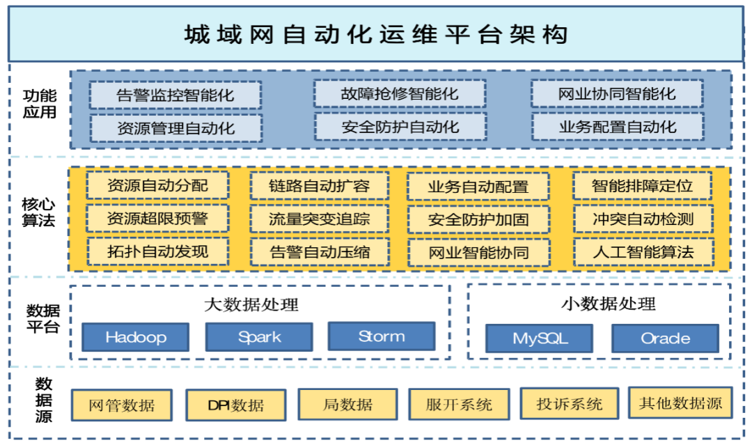 (4)功能应用:应用层主要实现6大功能,包括告警监控智能化、资源管理自动化、故障抢修智能化、安全防护自动化、业务配置自动化和网业协同智能化。