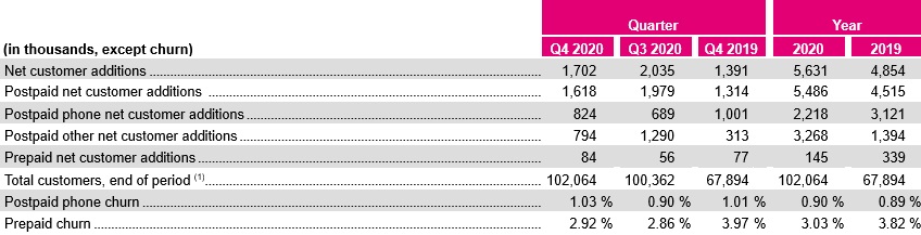 IT之家了解到,T-Mobile 2020 年全年新增客户数为 560 万,总客户数量达到 1.021 亿。2019 年新增客户数为 485 万,总客户数为 6789.4 万。
