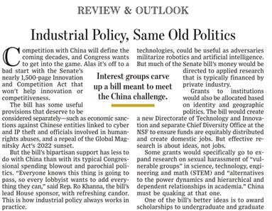 上周四,美国参议院推进了一项全面立法计划,旨在提高美国对中国技术的竞争力的《创新与竞争法案》,华尔街日报对此发表社评,认为《创新与竞争法案》对美国半导体行业实施政府补贴,只会浪费纳税人的钱。