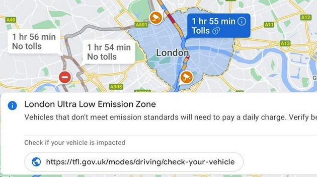 据报道,谷歌地图现在可以向伦敦等城市的驾驶员发出警告,提示他们将会进入需要收费或罚款的低排放区。