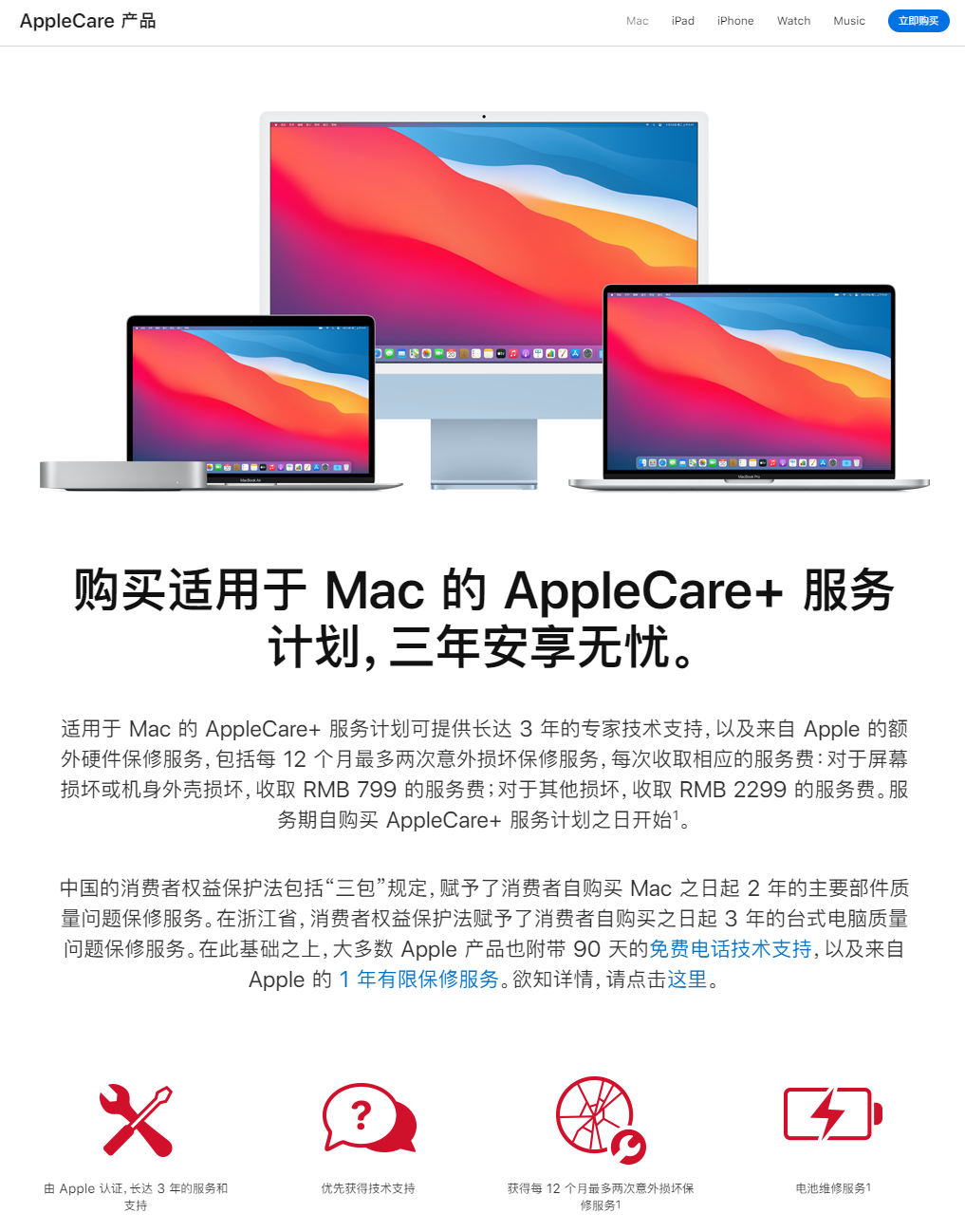 AppleCare+ 是苹果为 iPhone、Mac、iPad和 Apple Watch 提供的高端技术支持服务,同时也将意外损坏涵盖在内。