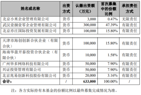 该基金计划募集总规模为 100 亿元,首次募集规模为 63.3 亿元,执行事务合伙人为北京小米企业管理有限公司(以下简称“执行事务合伙人”或“普通合伙人”)。
