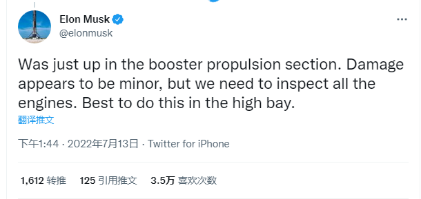 本周一,7 号超级重型助推器在 SpaceX 位于得克萨斯州南部的发射场进行地面测试时发生爆炸,随后被工程技术人员从发射台拆走。马斯克在一封电子邮件中说:“损坏是轻微的,但助推器将被转移回高舱进行检查,可能会在下周返回发射台。”