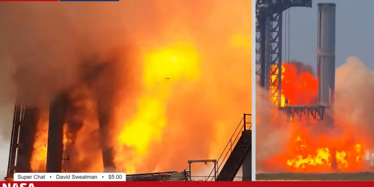 本周一,7 号超级重型助推器在发射台进行发射前测试时,发动机部分突然起火,冲击波掠过整个 SpaceX 发射场。