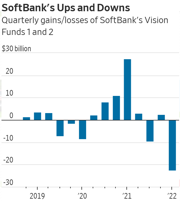 如今,随着科技股的暴跌,软银的亏损也在不断增加。软银持有近 300 家私人公司的股票,尚未对其中的许多公司进行减记处理以反映股市的下跌。如果计入对这些公司的价值减记,软银的亏损将增大。