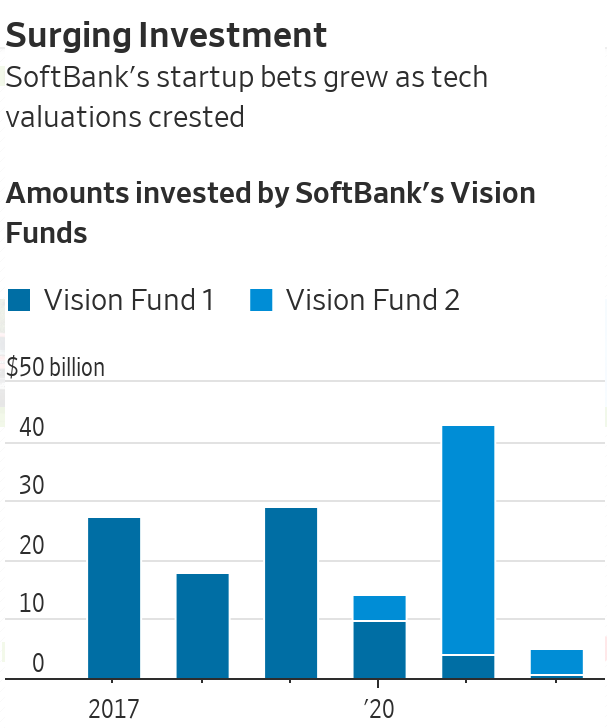 到 2020 年底时,成长型股票取得了蓬勃发展,软银开始获利。软银对外卖公司 DoorDash 和韩国电子商务公司 Coupang 的两笔早期投资在顶峰时期产生的账面利润合计超过 350 亿美元。