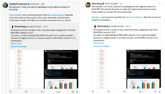 今早北京时间凌晨1点27分,此事件迎来终局:斯坦福 Llama3-V 团队的两位作者 Siddharth Sharma 和 Aksh Garg在 X 上就这一学术不端行为对面壁 MiniCPM 团队正式道歉, 表示会将 Llama3-V 模型悉数撤下。相似内容的道歉信,已于几小时前被作者发出一次,但被迅速删除。