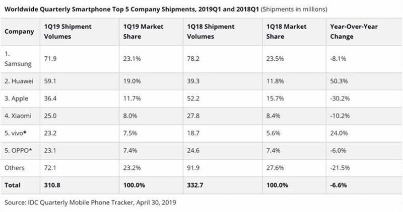 市场调研机构IDC日前发布的2019年第一季度智能手机的出货量报告显示,三星以23.1%的市占率居第一。然后是华为和苹果。现在华为有自己的芯片,苹果也有自研芯片的打算。