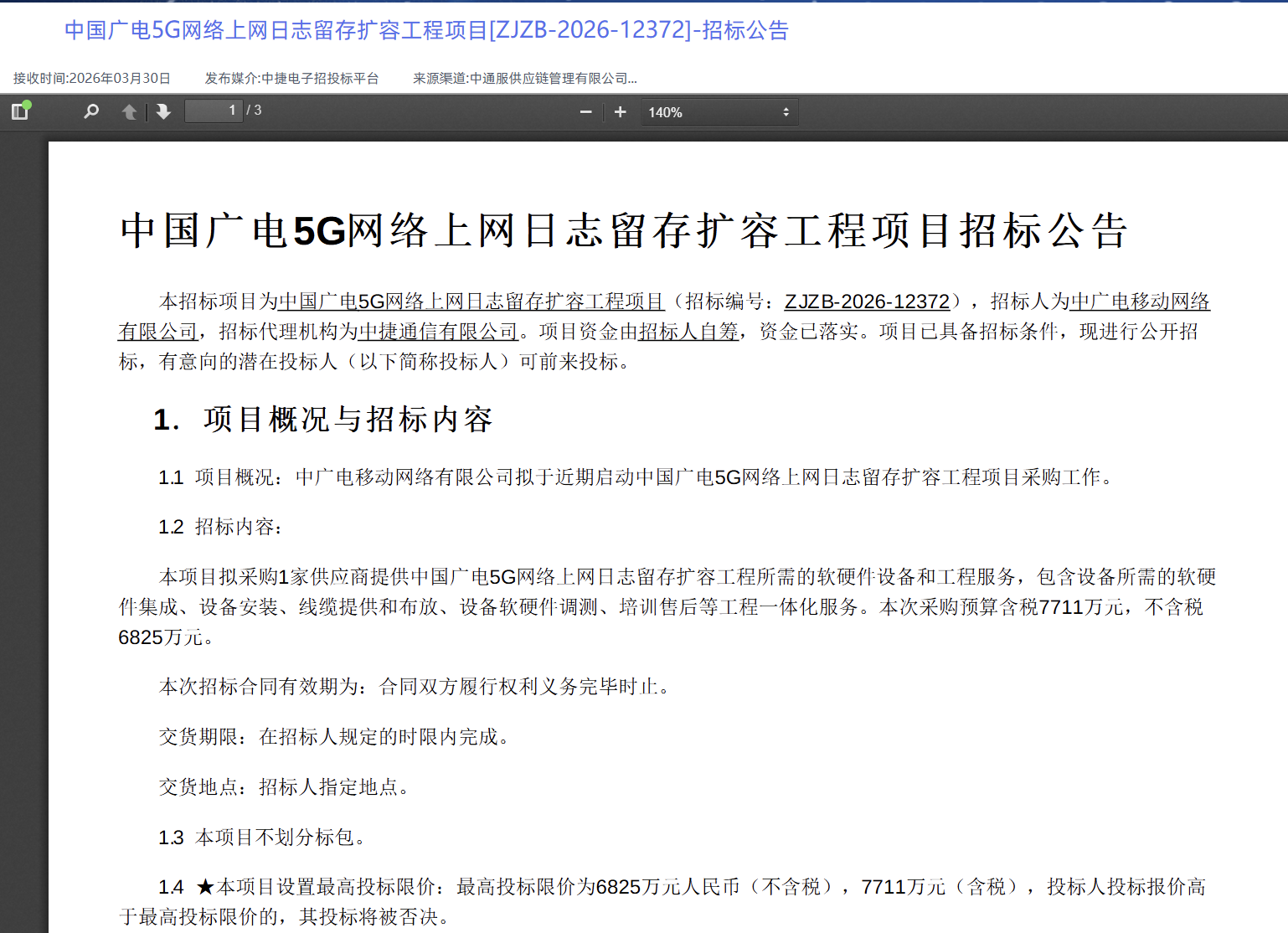 3月30日,中广电移动网络有限公司发布《中国广电5G网络上网日志留存扩容工程项目招标公告》,正式启动相关采购工作。