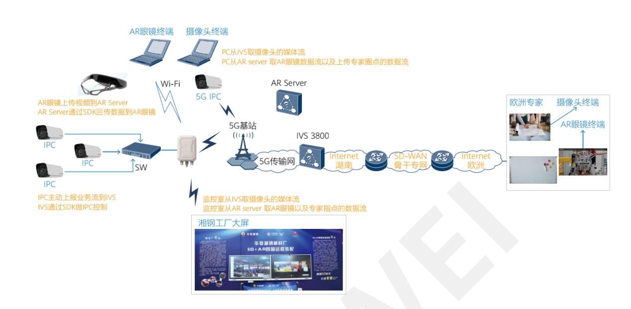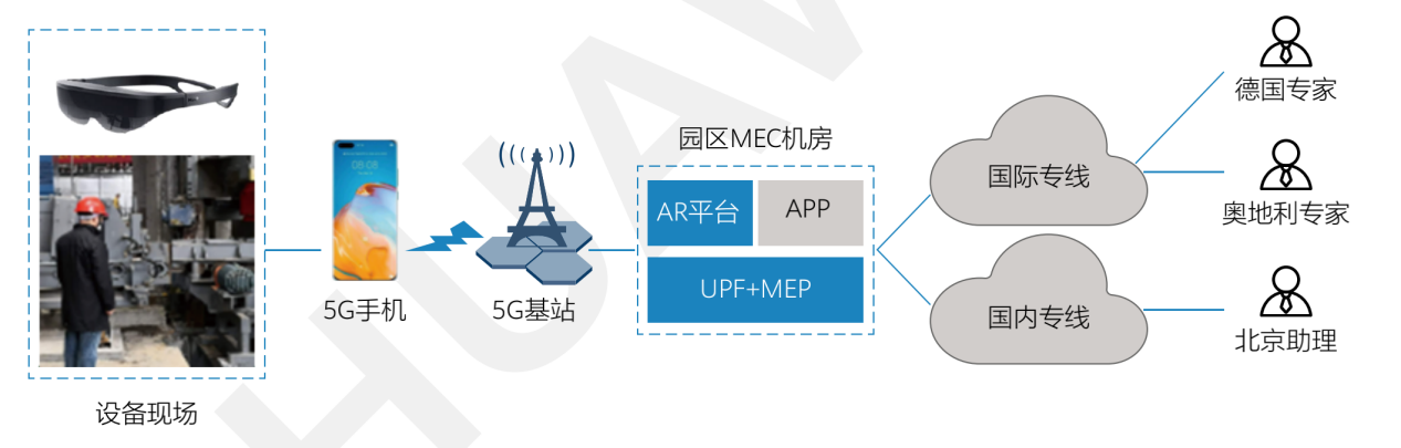 在应用场景中,现场工程师将现场环境视频和第一视角画面通过5G网络实时推送给位于远程厂家的技术人员,厂家依托AR的实时标注、冻屏标注、音视频通信、桌面共享等技术,远程配合钢厂工程师进行产线装配工作。