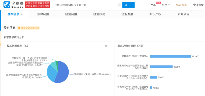 11月1日,国家集成电路产业投资基金二期股份有限公司新增对外投资,被投资企业为合肥沛顿存储科技有限公司(下称“沛顿存储”),出资9.5亿人民币,占比达31%。