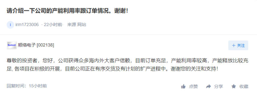 1月18日晚间,顺络电子在投资者互动平台,就产能利用率及订单情况表示:“公司获得众多海内外大客户信赖,目前订单充足,产能利用率较高,产能释放比较充足,各项目在积极的开展,目前公司正在有序交货及有计划的扩产进程中。”