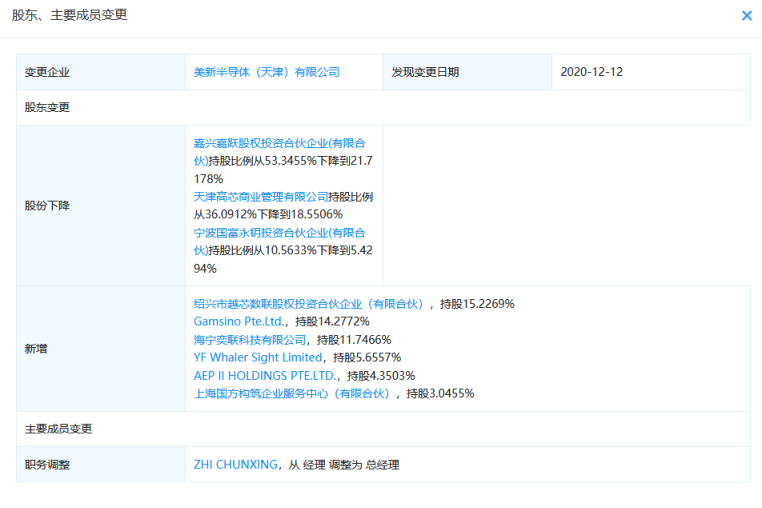 企查查显示,美新半导体(天津)有限公司发生工商变更,新增绍兴市越芯数联股权投资合伙企业(有限合伙)、Gamsino Pte.Ltd.、海宁奕联科技有限公司等股东。其注册资本从“113601万元人民币”增加到“233618万元人民币” 。
