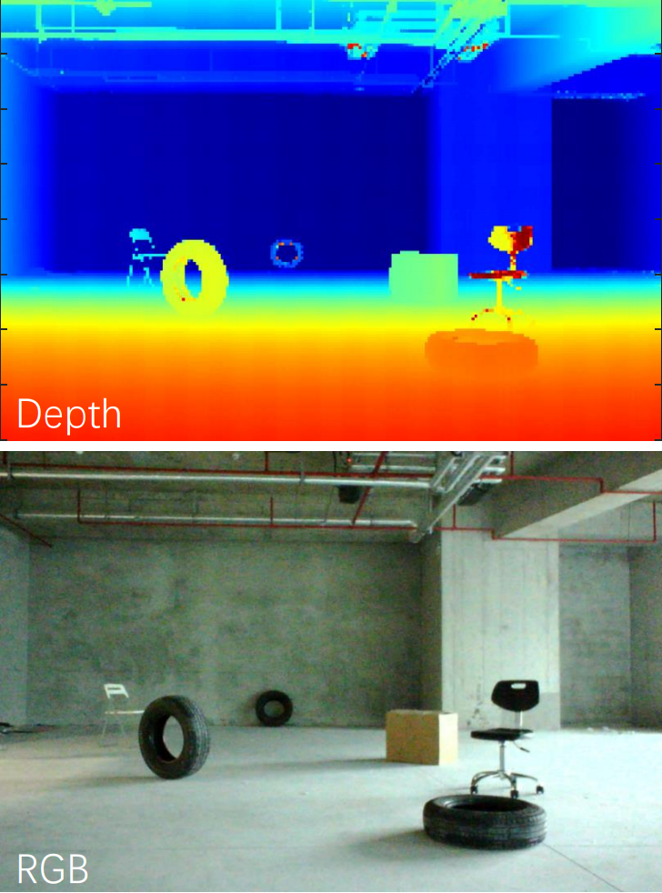 ▲ 上图为灵眀光子 ADS3003 的室内场景远距离成像,下图为同一场景的 RGB 成像,供参考。最远的轮胎距离传感器达 13 米,轮廓依然清晰可见。可见 ADS3003 在保证低功耗和大视场角的前提下对于低反射率物体依然有良好的测距能力。