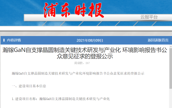8月9日,浦东时报刊登了“瀚镓GaN自支撑晶圆制造关键技术研发与产业化项目的环评公示”。